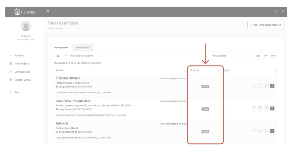Entender os status de andamento Estimated reading: 1 minute Observação Na tabela Todas as análises , é a coluna Situação que indica o status do andamento da análise. Há os seguintes status de andamento no sistema: Pronta: a análise está pronta; Aguardando: a análise está processando. Isso pode demorar, quanto maior a análise, maior o tempo de processamento; Falhou: por diversos motivos, a análise não foi processada até o fim. Para saber mais a respeito do erro, veja como Consultar os dados técnicos. Em processamento: qual a diferença com “Aguardando”? A qualquer momento, é possível atualizar o andamento da análise, clicando nas setas de atualização.