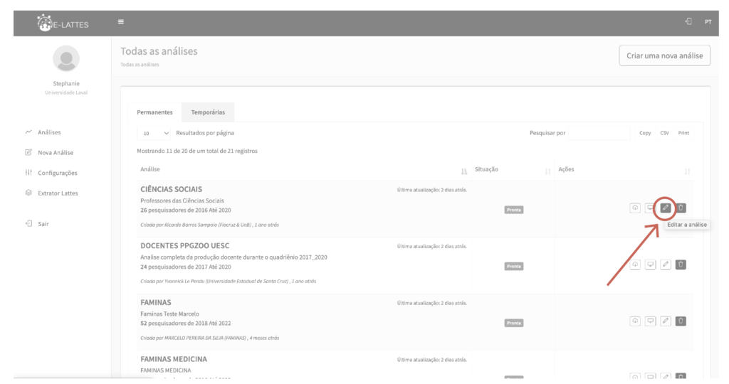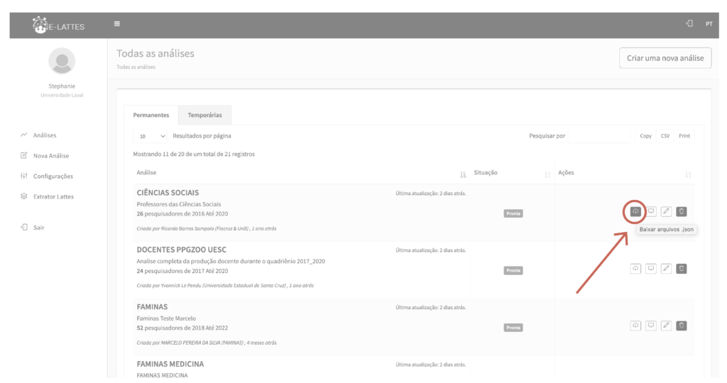 - na página Todas as análises , na aba Permanentes ou Temporárias , clique no botão Baixar arquivos .json referente à análise desejada;