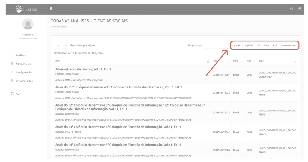 Também, é possível baixar um arquivo de dados específicos, pois para todas as tabelas das análises, as opções Copiar, Imprimir, CSV, Excel, e PDF são disponíveis no canto superior direito.