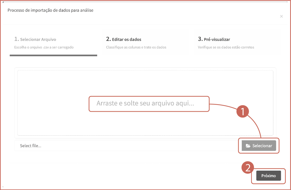 Clique no botão Selecionar e indique o arquivo CSV desejado, ou, simplesmente, arraste e solte seu arquivo na tela.