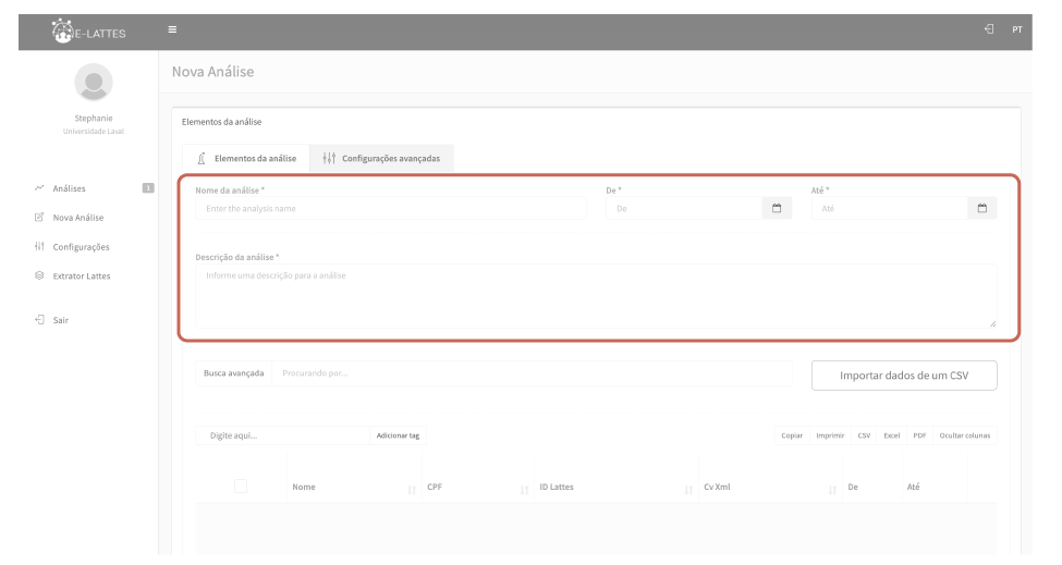 Todos os campos são obrigatórios para criar a análise.