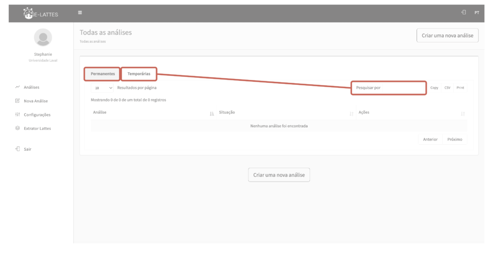 Pesquisar análise Estimated reading: 1 minute Na página Todas as análises , é possível pesquisar uma análise na aba Permanentes ou Temporárias . O campo Pesquisar por está disponível acima, à direita da tabela Pesquisa o que??? exemplo?