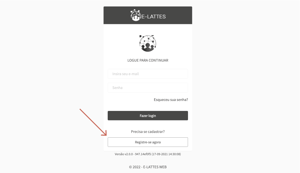 Por padrão, a tela de entrada do sistema é a tela de login. Para acessar a tela de cadastro, clique no botão Registre-se agora